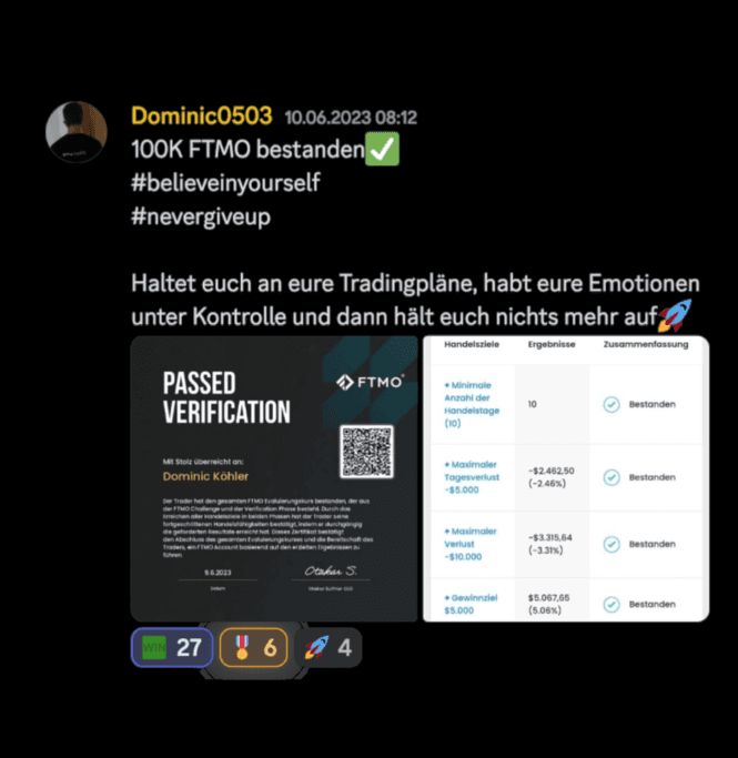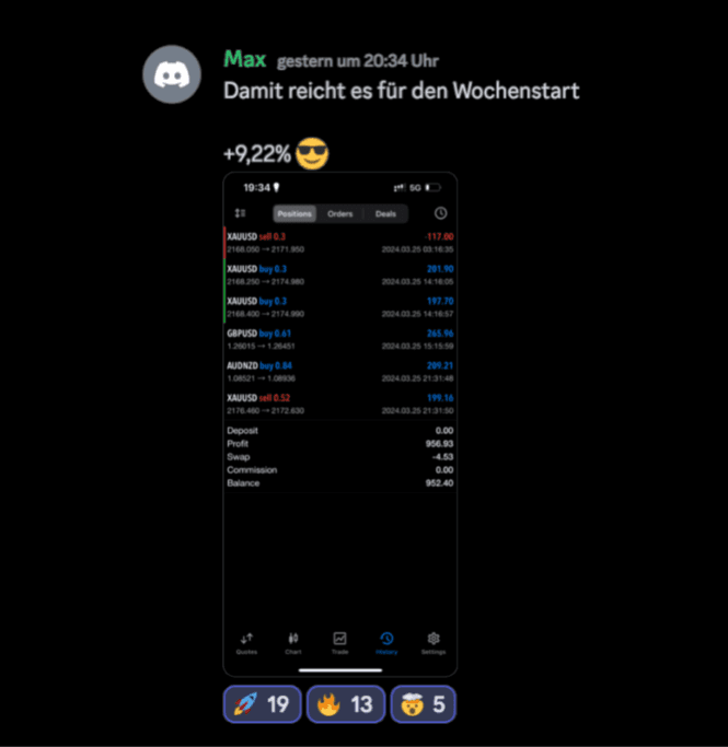 Tausche dich mit über 300 aktiven Tradern aus, erhalte tägliche Marktanalysen und erlebe ein starkes Netzwerk, das dich auf deinem Weg unterstützt.