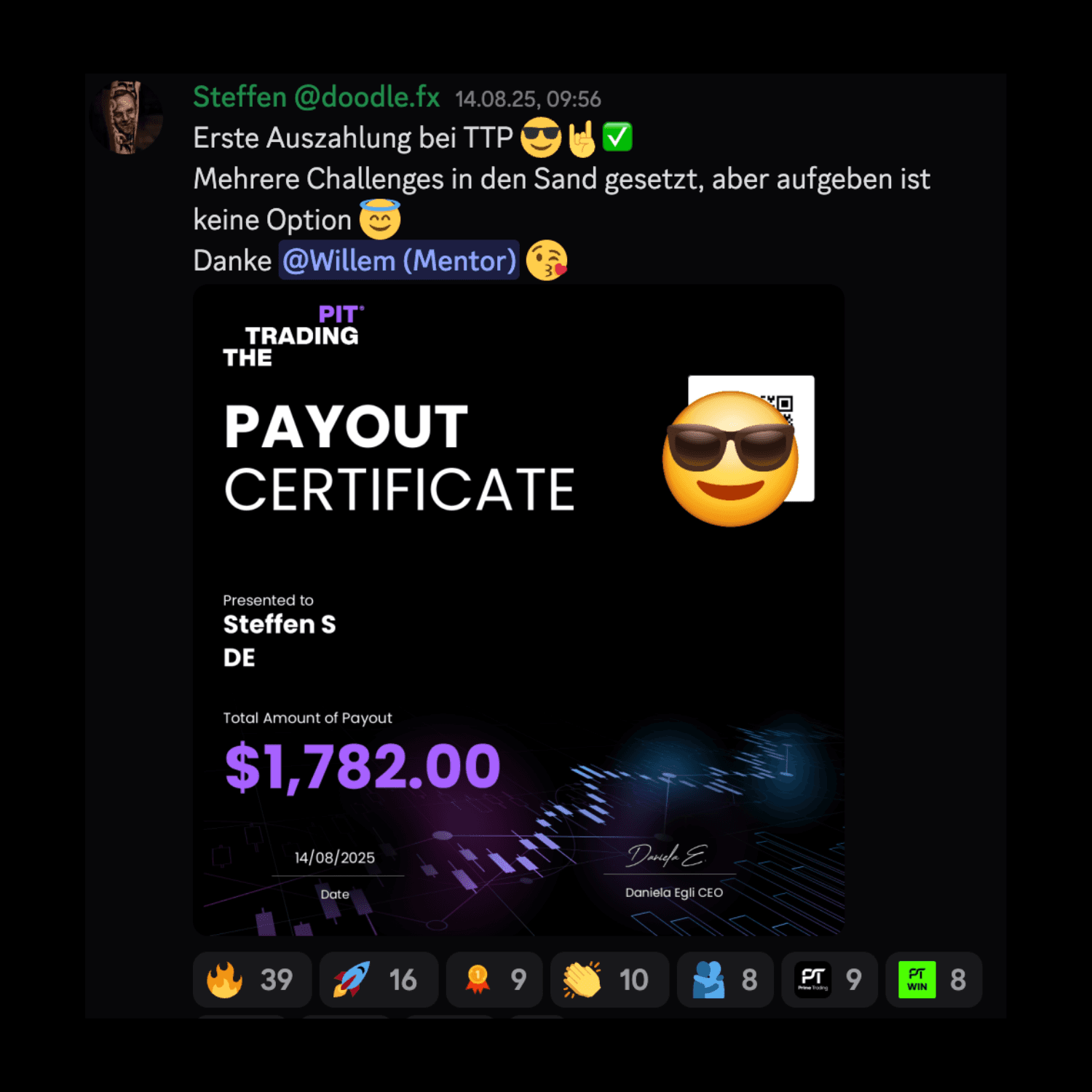 Die Pro-Mitgliedschaft ist dagegen der perfekte nächste Schritt, wenn du richtig Gas geben willst. Du bekommst Zugriff auf die komplette Ausbildung mit über 120 Videos, lernst die TrendFlow-Strategie im Detail kennen und kannst zweimal pro Woche beim Live-Trading von Willem dabei sein – ganz nah an der Praxis. Zusätzlich bist du Teil der aktiven Discord-Community mit Q&A-Sessions, exklusiven Kanälen und dem Zugang zur Prime Trading App, in der du deinen Fortschritt, deinen Trading-Plan und dein Journal strukturiert verwalten kannst. Auch zu persönliche Community-Treffen vor Ort, wirst du ab sofort Zugang haben.