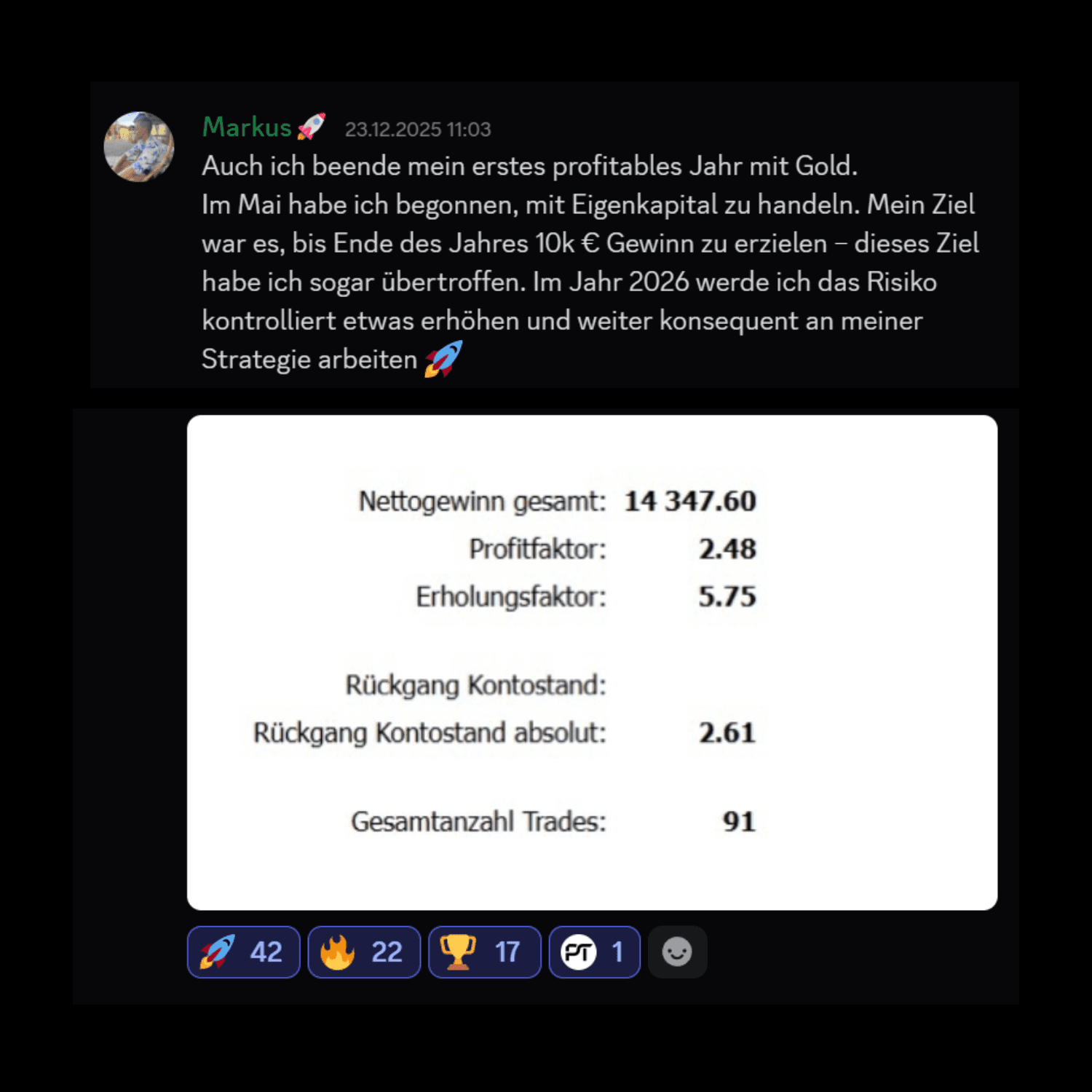 Tausche dich in einer Community mit +500 aktiven Mitgliedern und profitablen Tradern aus. Erhalte tägliche Marktanalysen, profitiere vom direkten Support bei Fragen und nimm an exklusiven Community-Events teil. Hier wirst du Teil einer Gemeinschaft, die dich unterstützt und motiviert.